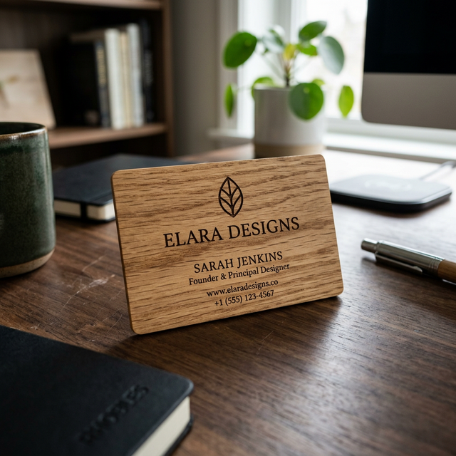 Pour une image éco-responsable et chaleureuse. Gravure laser précise sur chêne, bambou ou noyer.
